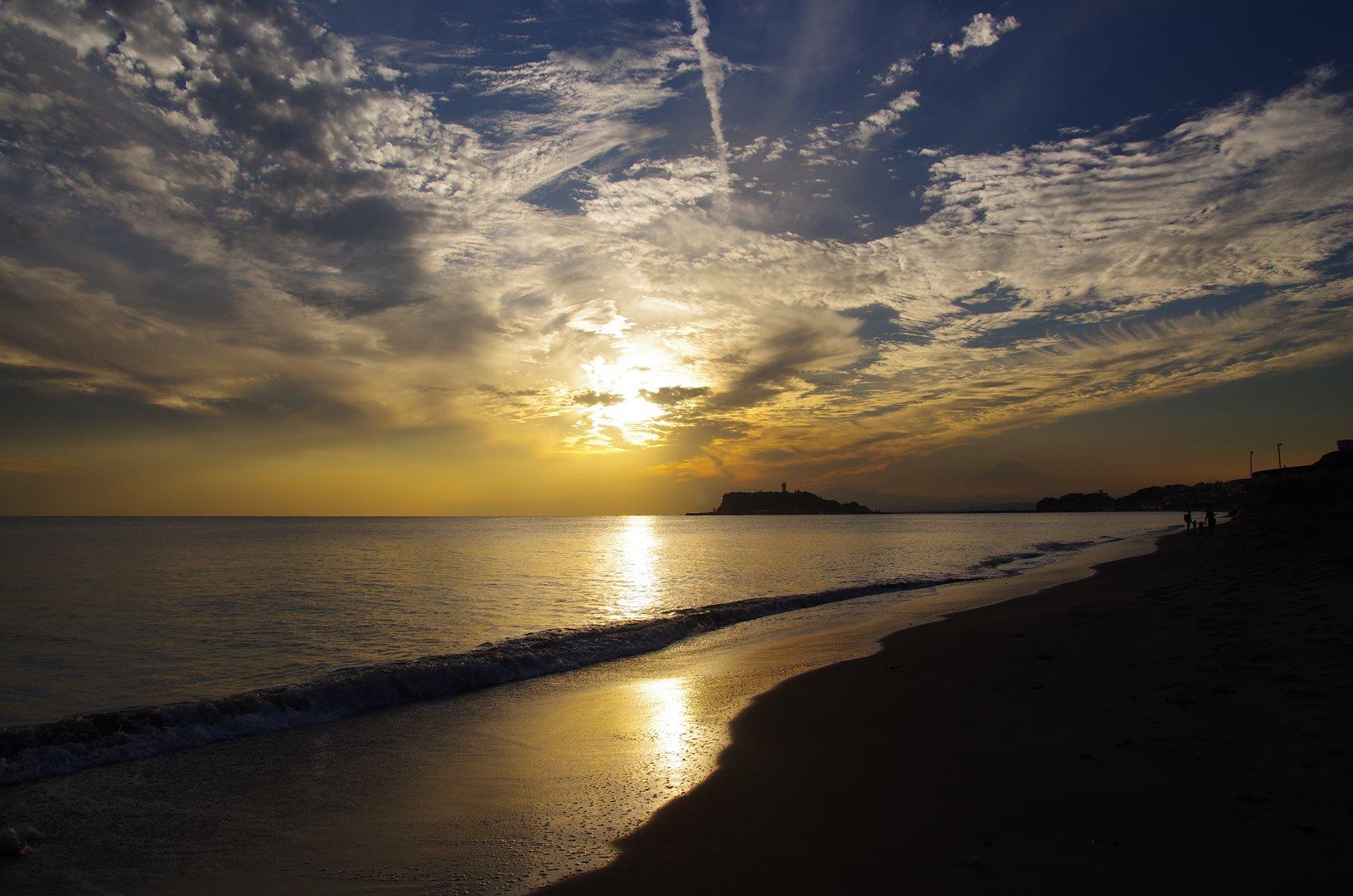 湘南夕景は素晴らしいですね 皆さんと何回か行きましたがこのような雲と黄金の道は初めてですね