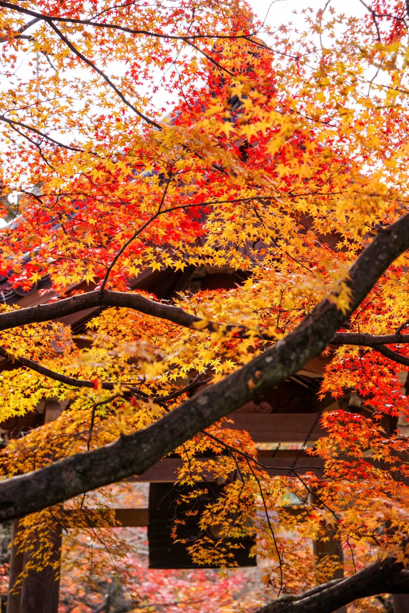 背景の鐘つき堂の黒いところにモミジが浮かび上がって素晴らしいです。
