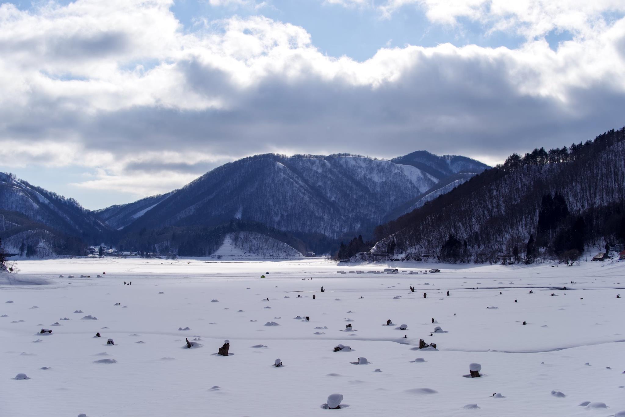 そうです、いくつかある湖は全部凍結しています。これは凍結した湖の上に降った雪で、切り株が点々としているところです。