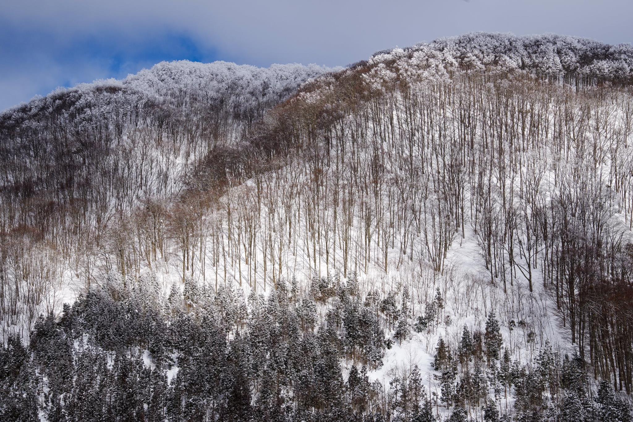 山肌、木々の表情、雪の付き具合、そして青空の色、すっきりしてしかも豊かな景色ですね。