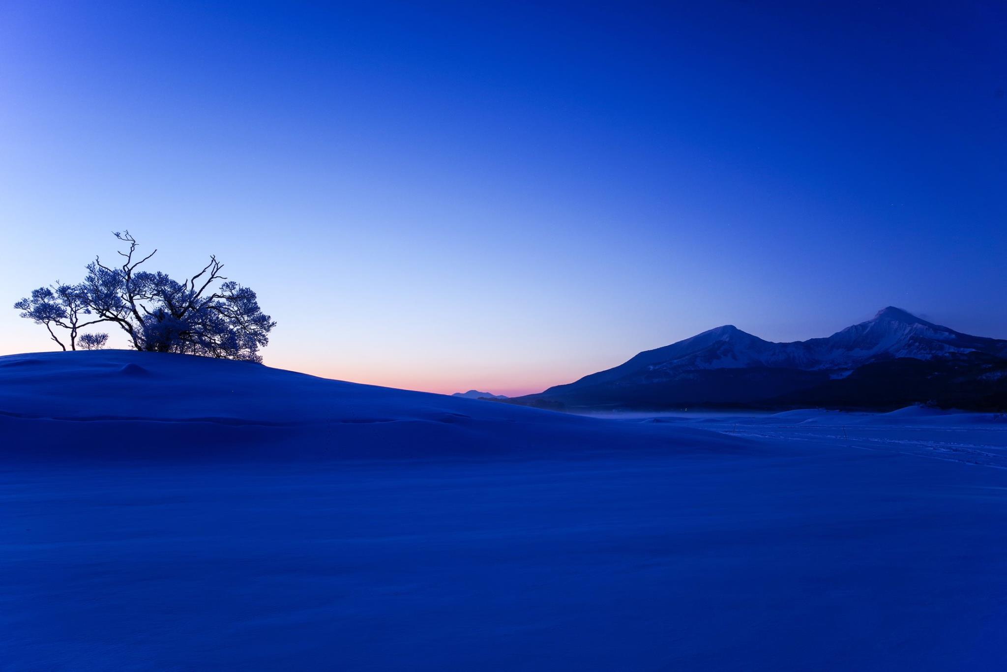 雪景色。淡いブルーのグラデーションが見せ所ですか。大きなセンサーですから階調が滑らかです。明ける朝の一番美しい時刻のようです。立木と磐梯山が左右に対比、バランスされました。北海道の美瑛の丘を見るようです。見る者にそれがイメージされますから、『もう少し広く撮ってよ』と思うようです。で、もう少し引くか、広角で左右の広さをデホルメしてはどうかなと思いました。