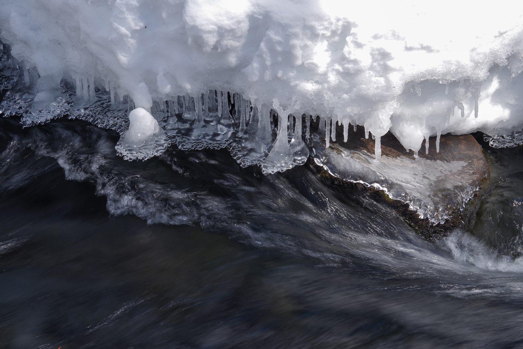 右側から光が当たっていますか?光が入った部分が氷柱も流れもきれいです。