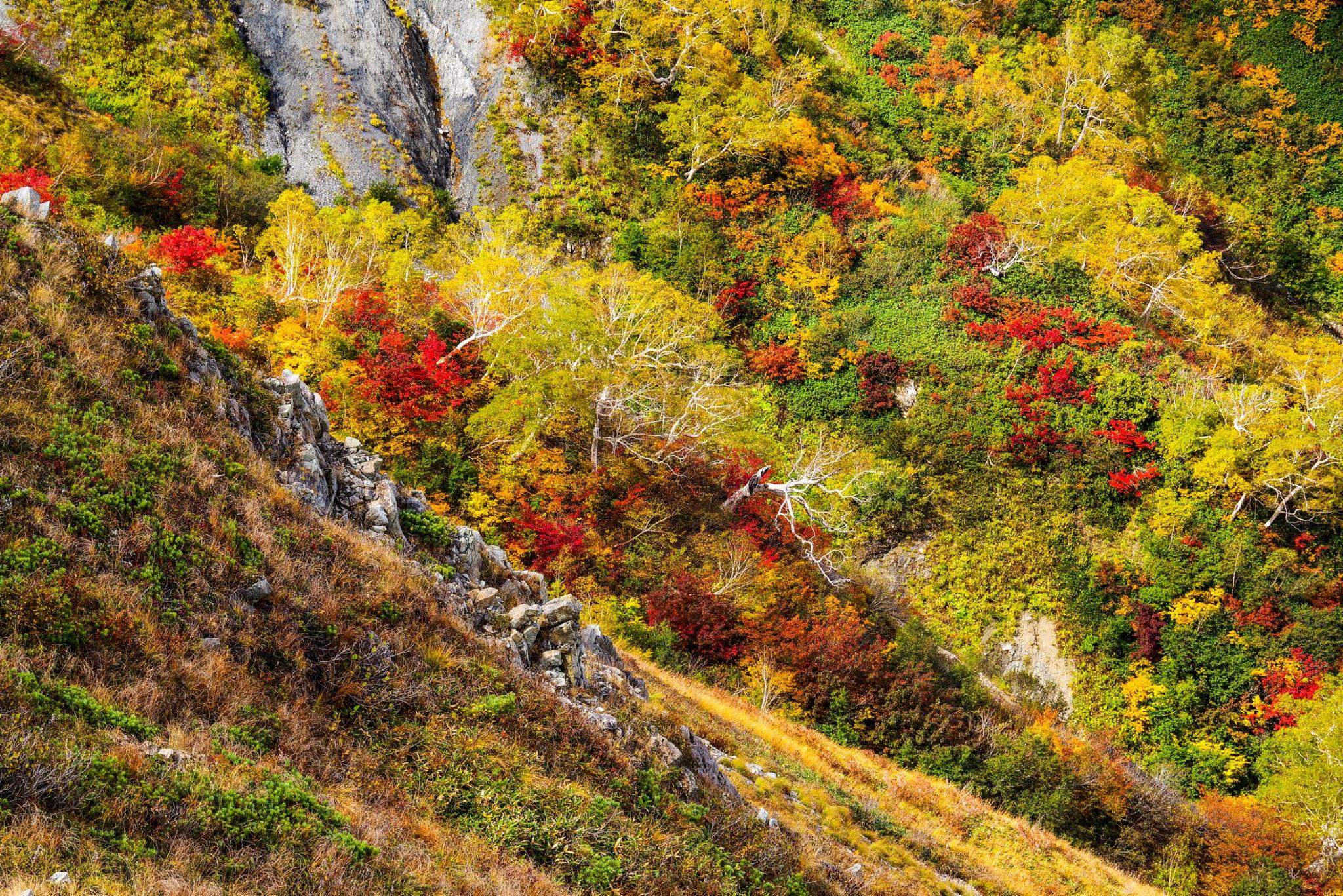 唐松岳の山腹は錦繍の紅葉。