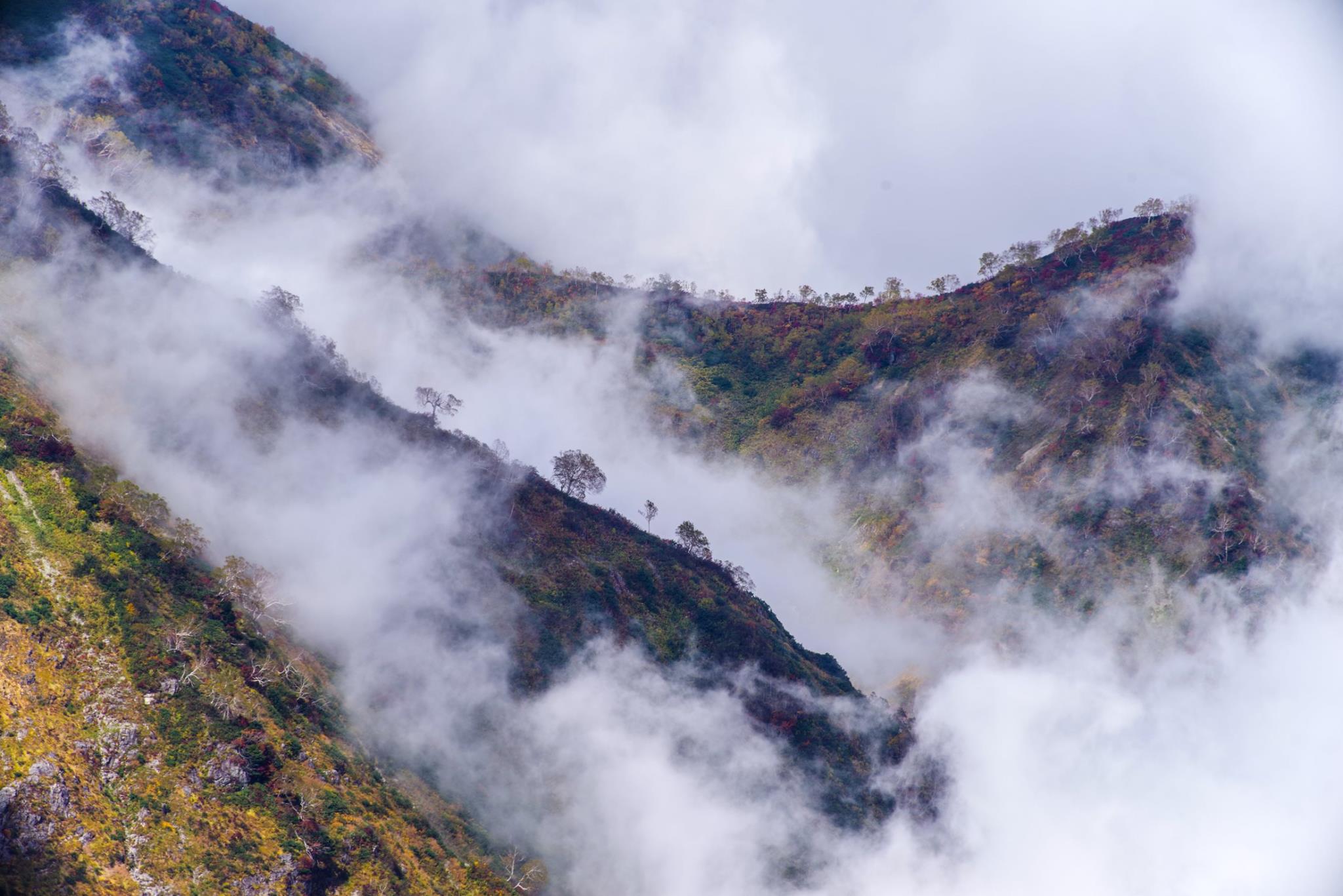 素晴らしい。谷筋にはガスが流れ、稜線の木々が顔を出し。この一瞬に出会えた幸せですね。