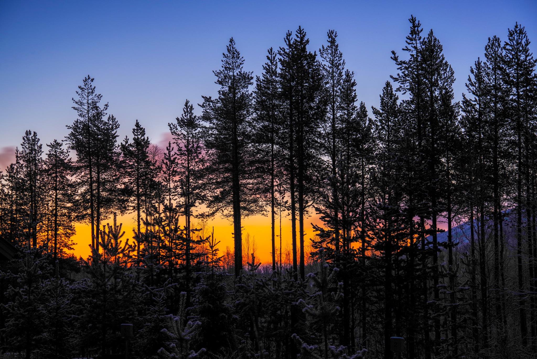 オーロラが見えるのは北の方向で湖に面しているんですが、朝日は東の方向なので、林の中から太陽が出て来ました。