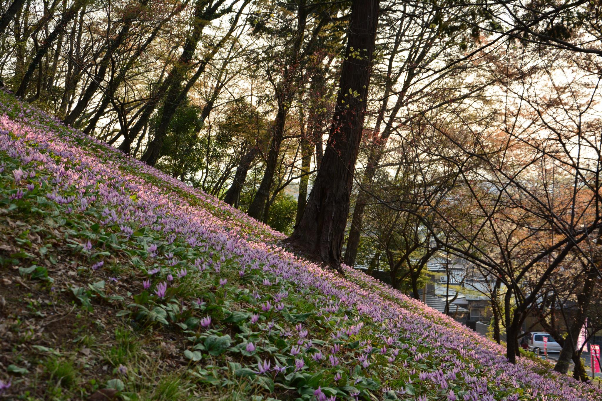こんばんは!夕陽でしょうか。光が当たったところの色が美しいです。すごい量のカタクリの花ですね。