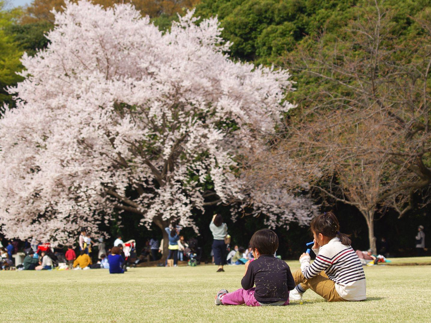 芝生の上に座ってしばらく待っていました。ちょうど遠くに桜が見えるような位置で狙ったのですが、桜の回りはどこも人だらけで、これを避けるのは難しそうです。