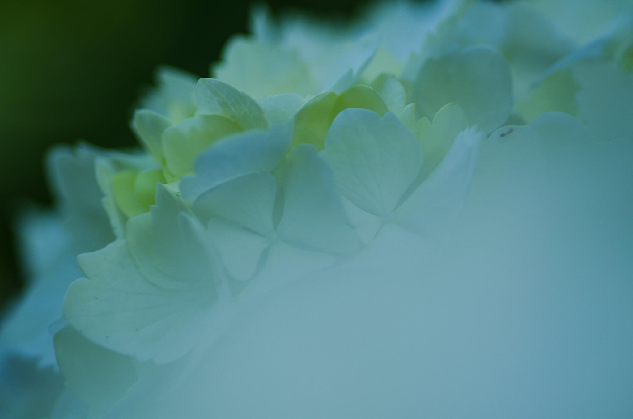 これはマクロで、レンズのすぐ前(フードに当たるくらいの距離)に白い紫陽花を置いて、少しその先にある(20cm程度)紫陽花を撮っています。