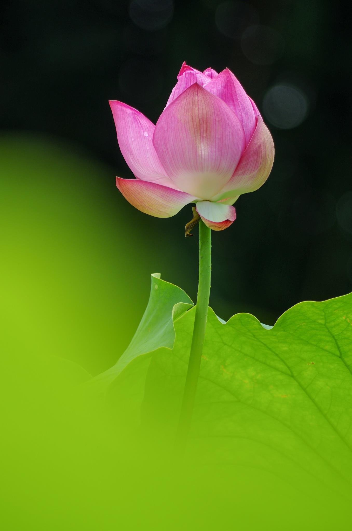 美しいですね。☆☆☆前ボケ、背景、縦構図、丸ボケ。この一枚に凝縮しましたか。蓮の花の茎がカーブを描いているのがまた良いです。葉っぱに邪魔されてもなお太陽の方へと伸びたのでしょう。