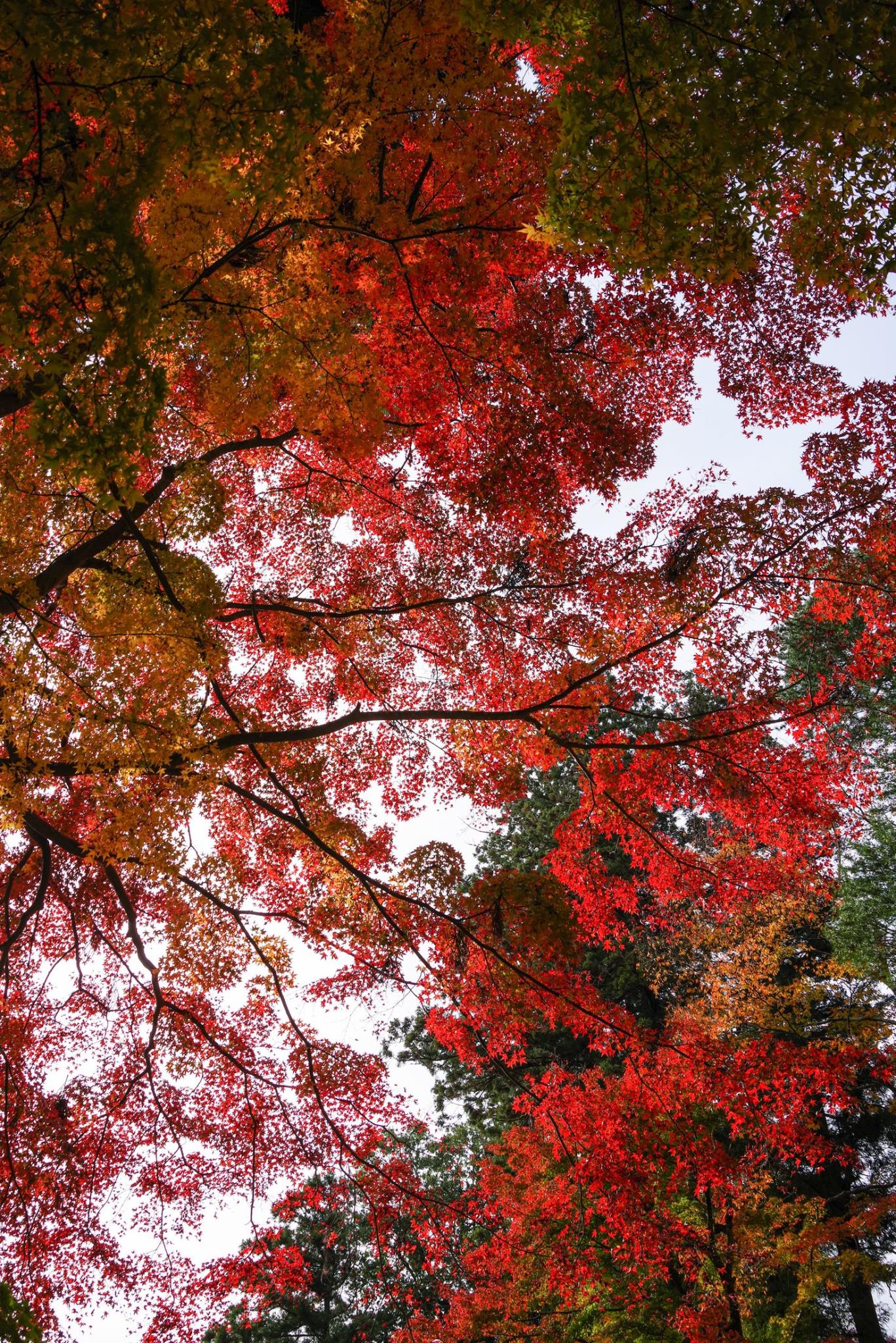空を覆いつくすような真っ赤な綺麗な紅葉ですね。大きい古木なのでしょう。