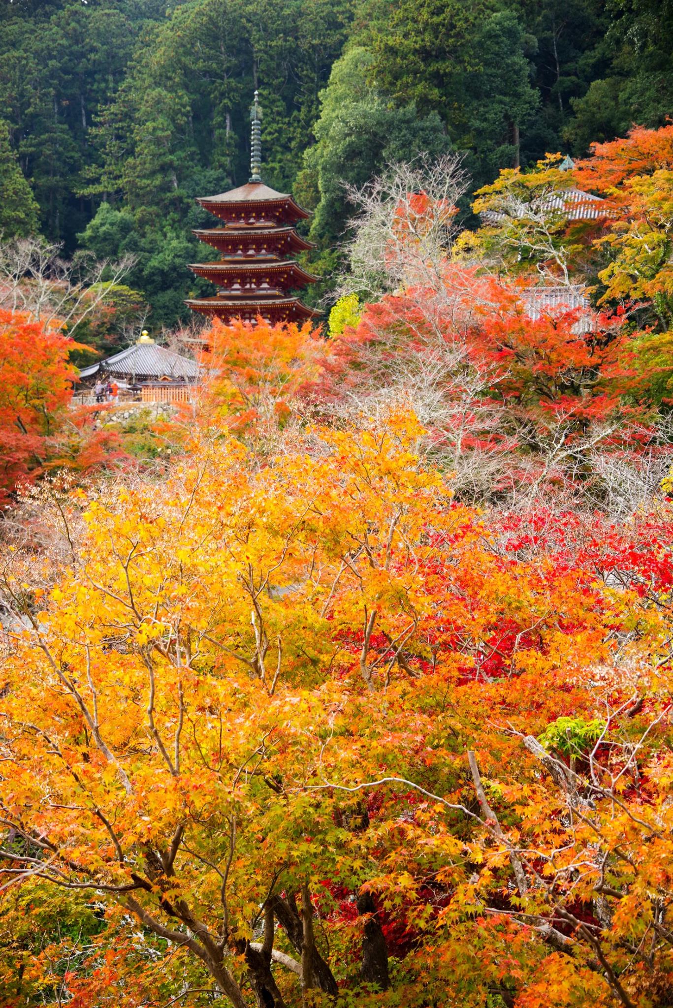 本堂の舞台からの見た五重塔ですか。紅葉・黄葉を纏った凛とした五重塔は綺麗ですね。