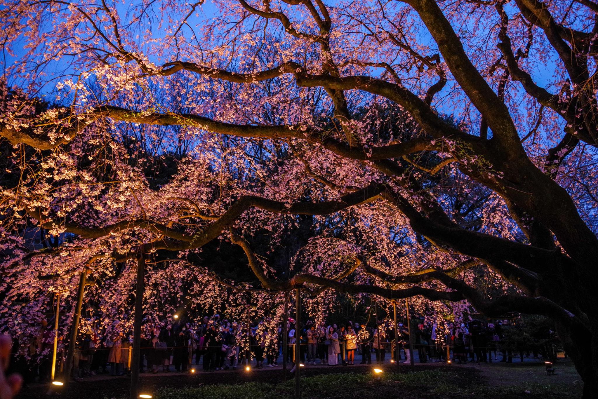 枝ぶりが良く、またパワーがあります。とても美しいです。空の色ライトアップの桜の色、良い時間ですね。
