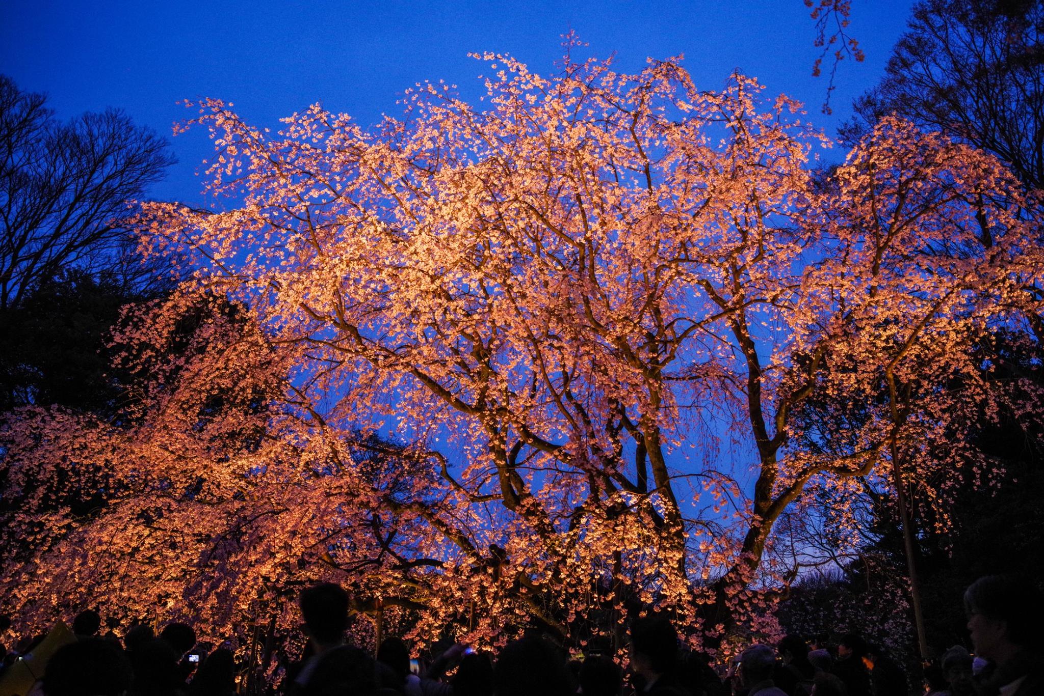 夕闇に桜が光っていますね。素敵な時間帯です。