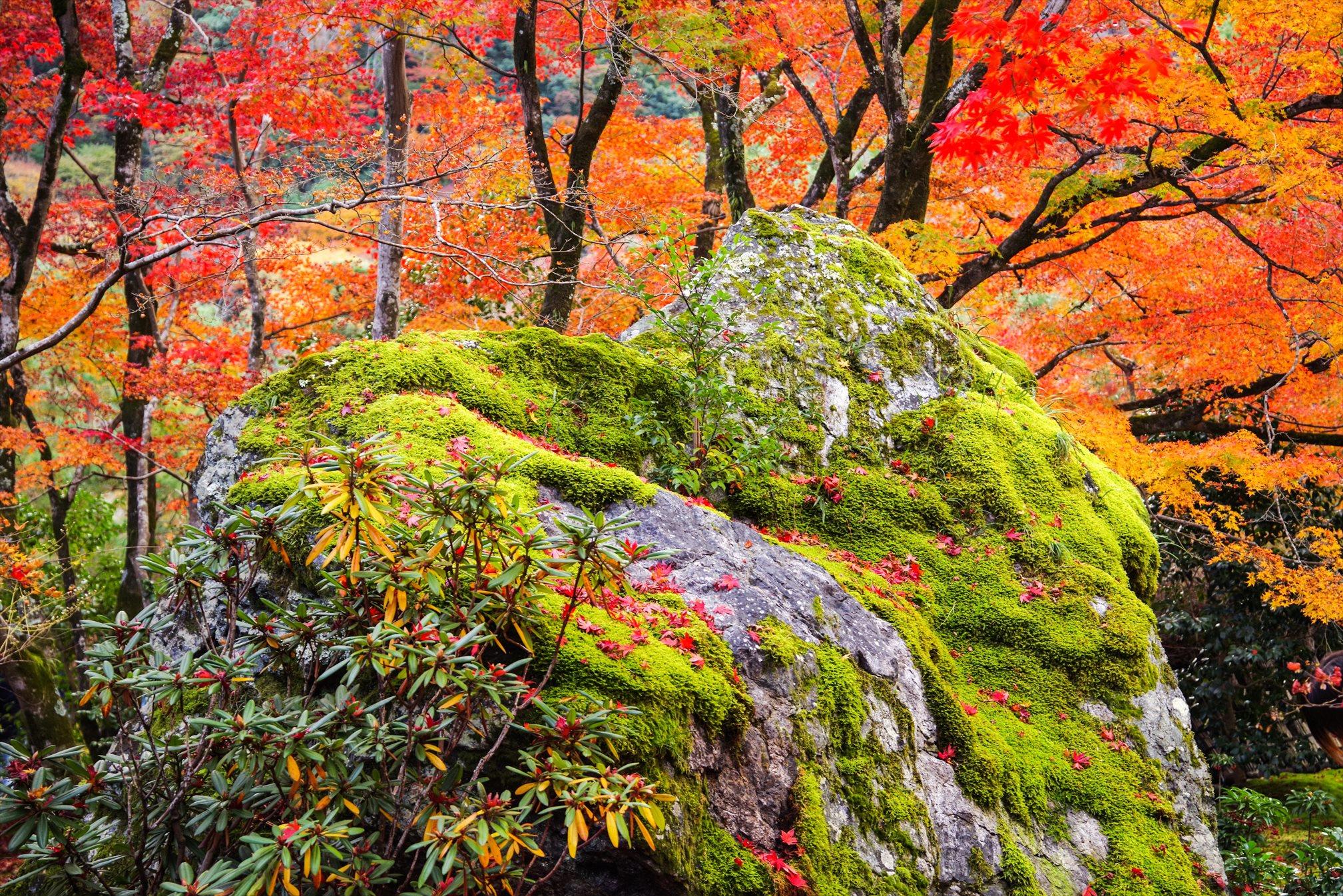 苔むした岩が良いですね。その上に赤いモミジが散って。