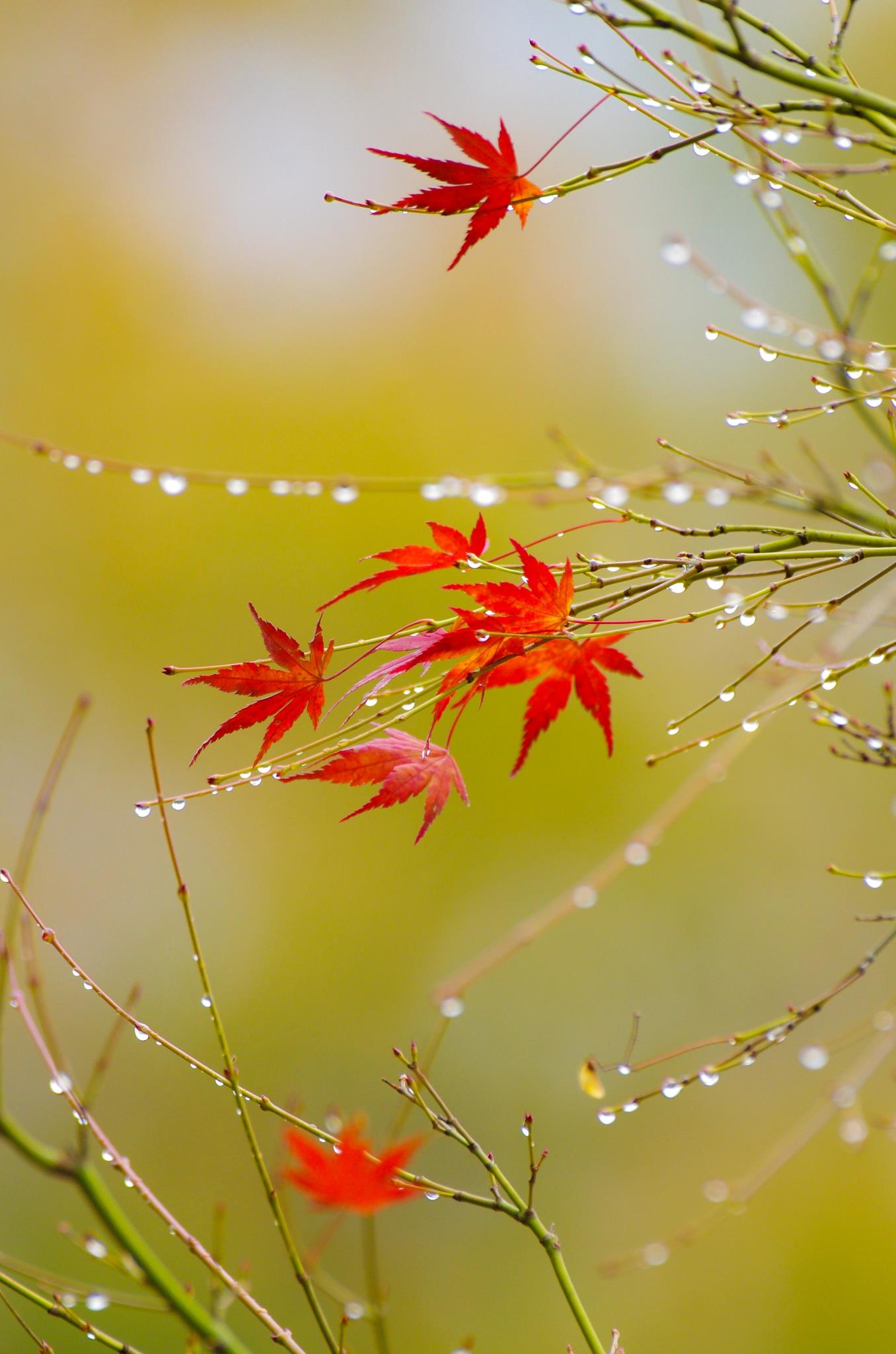 雨上がりの滴のボケも美しいしモミジの赤も柔らかく回った光で美しい。