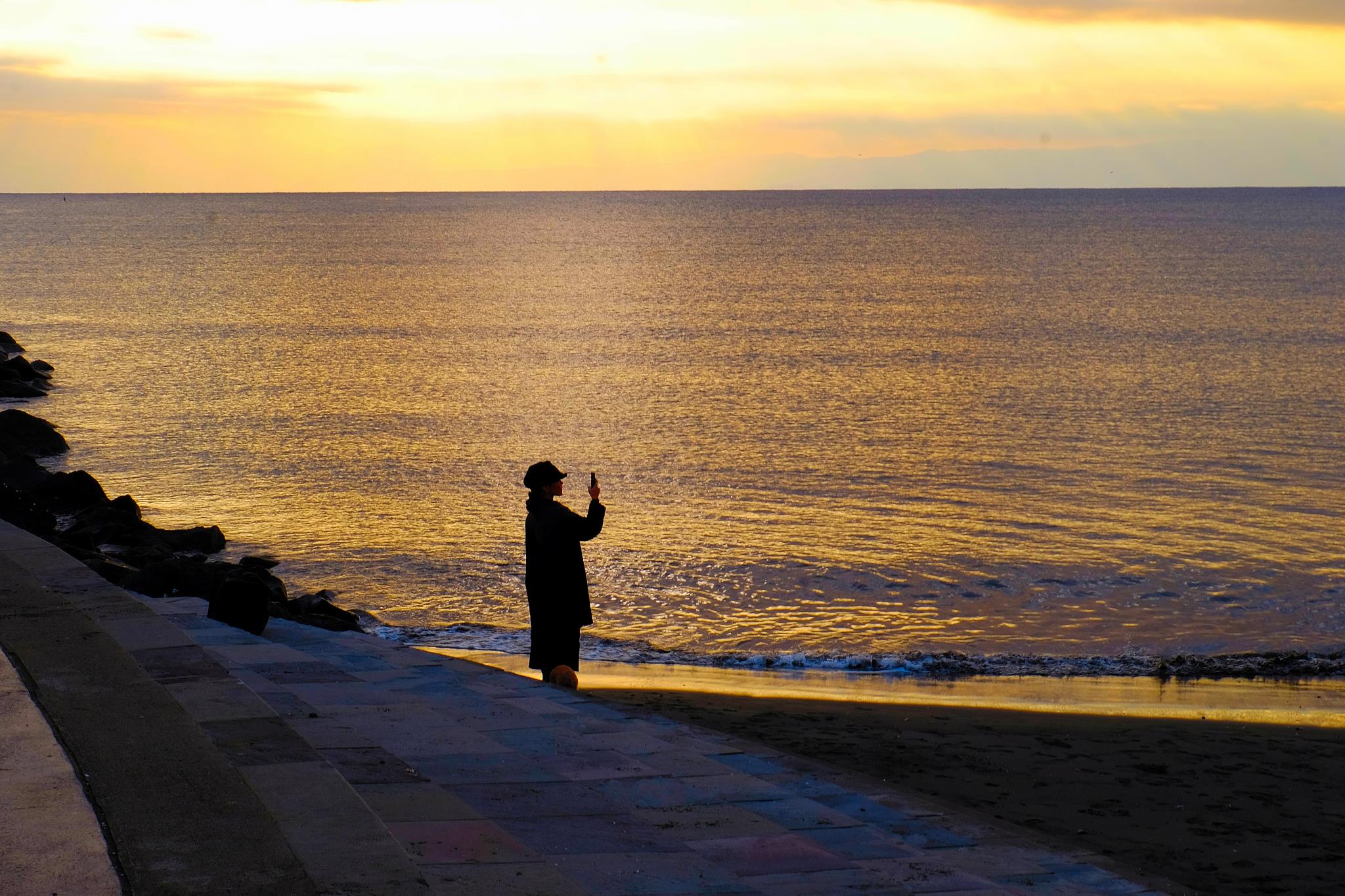 いいですね 黄金に輝く海にスマホを見ている女性をバランスよく写しましたね(最近はお子様だけでなく美しい人まで・・・)