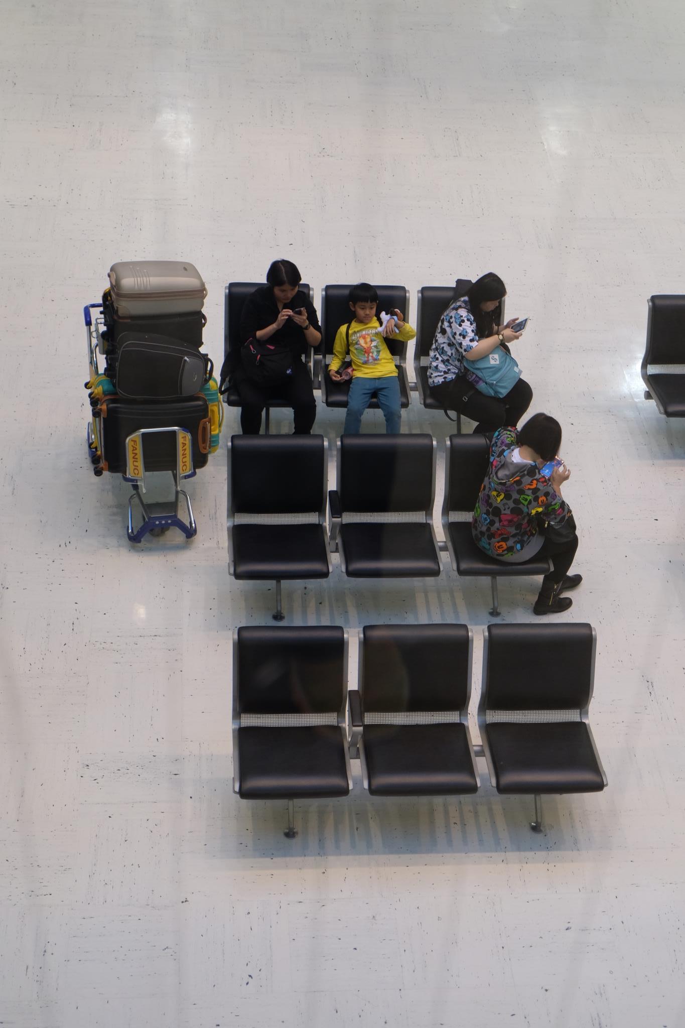 長いフライトに備えての一時休息の光景ですね。
