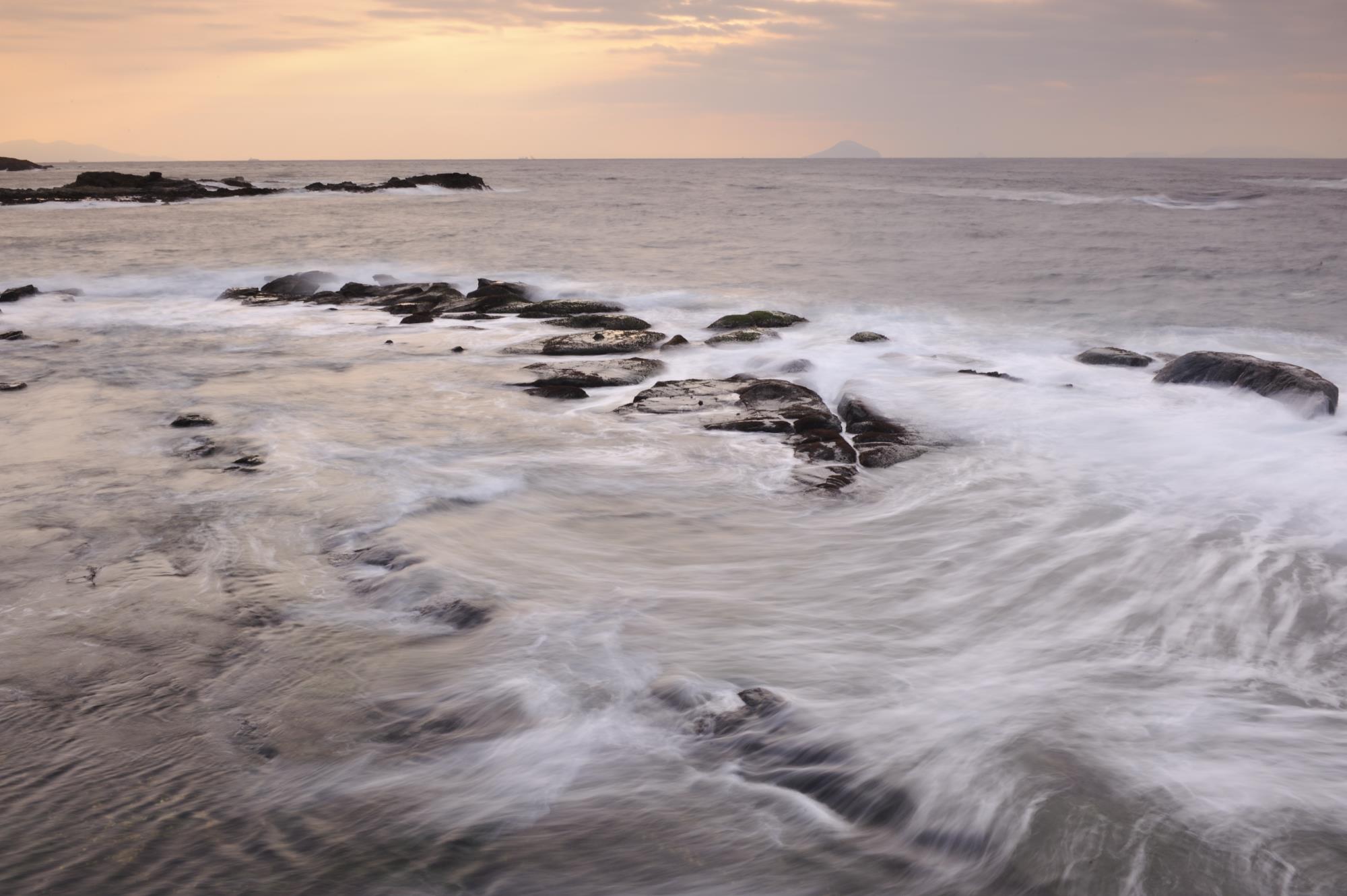 波が平らな岩を上りきり、一段低い岩に落ちる