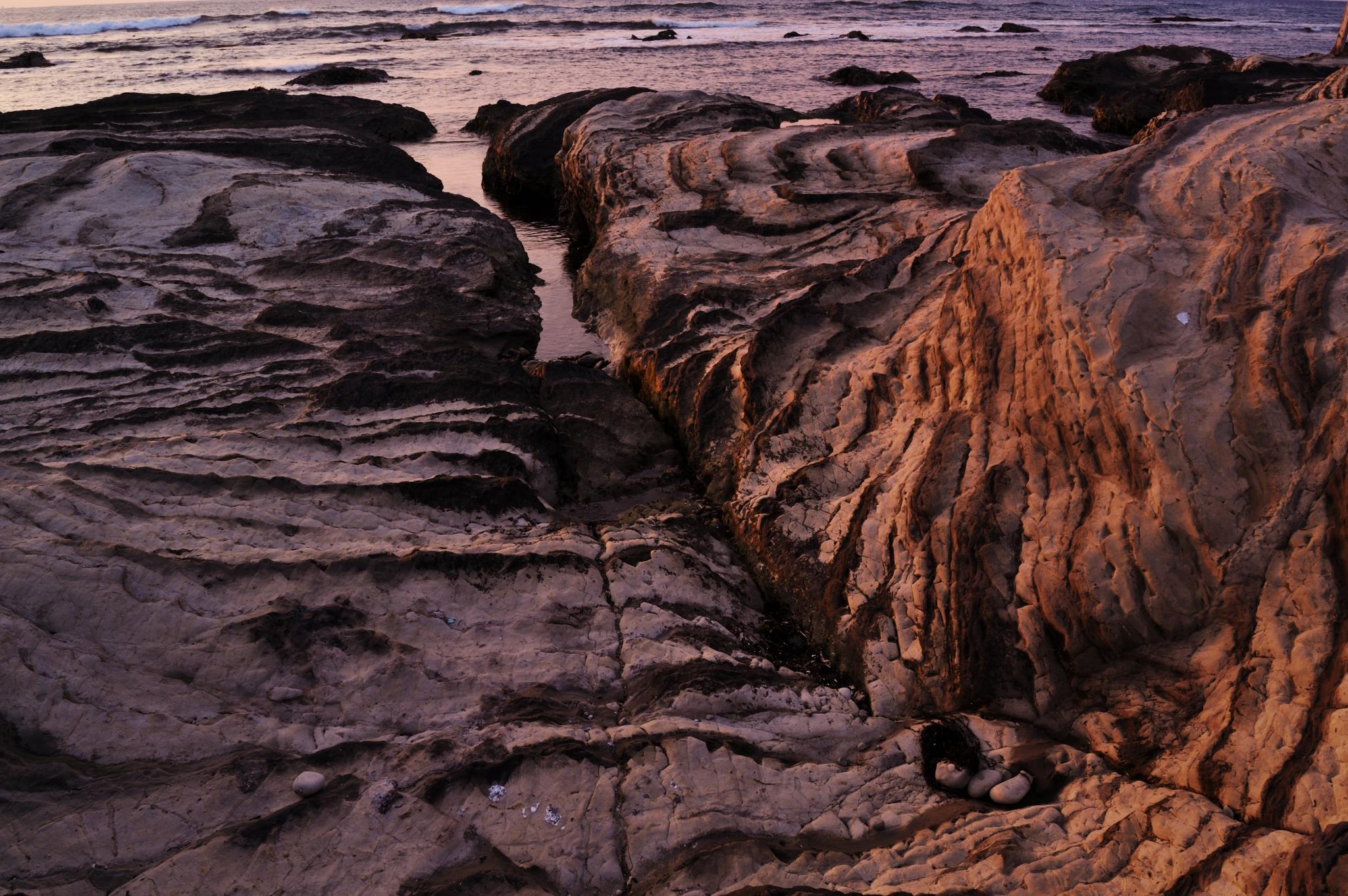 右側の三角上の岩礁側面に当たった朝日の色が良い感じに思えます。