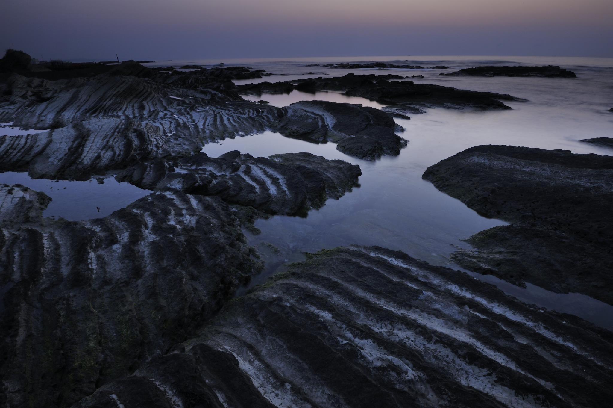 夕やみ迫る少し不気味な磯浜の感じですね。