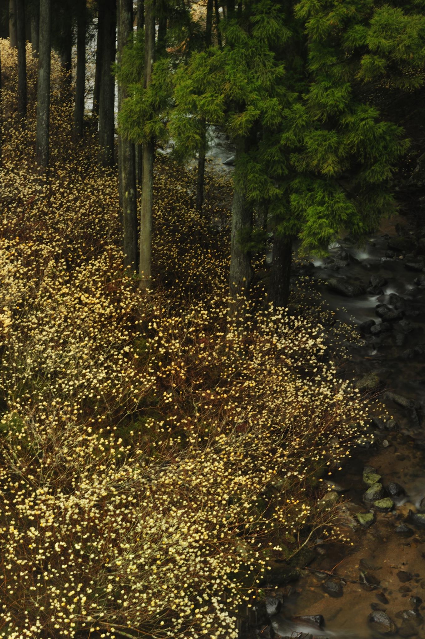 川の曲がった流れをうまく使ってミツマタと杉木立を入れられた作品が良いですね。