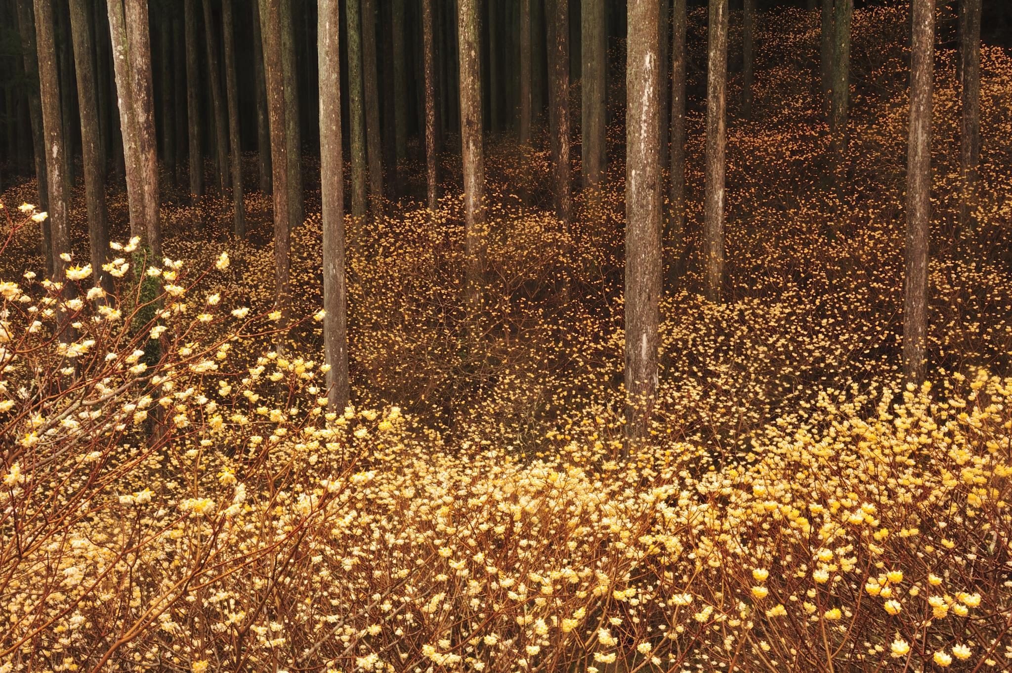 林床の奥が黒くつぶれないように、手前の明るいミツマタにハーフND4をかけてます。奥と手前の明度差を調整するわけです。