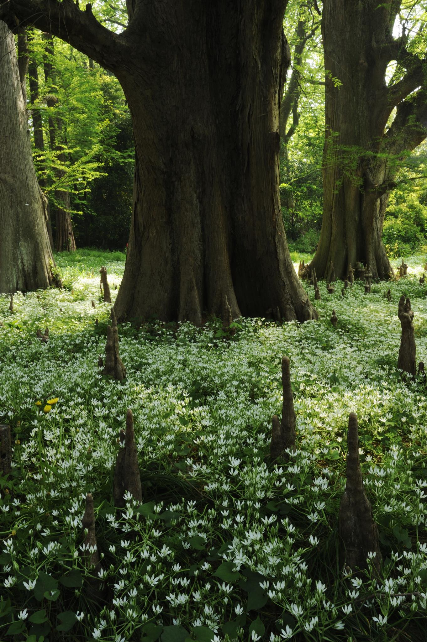 巨樹の太さと中心にドカーンと落ち着いた雰囲気で、さらに奥行きの暗闇が白い花を引き立てていましたね 素晴らしいです