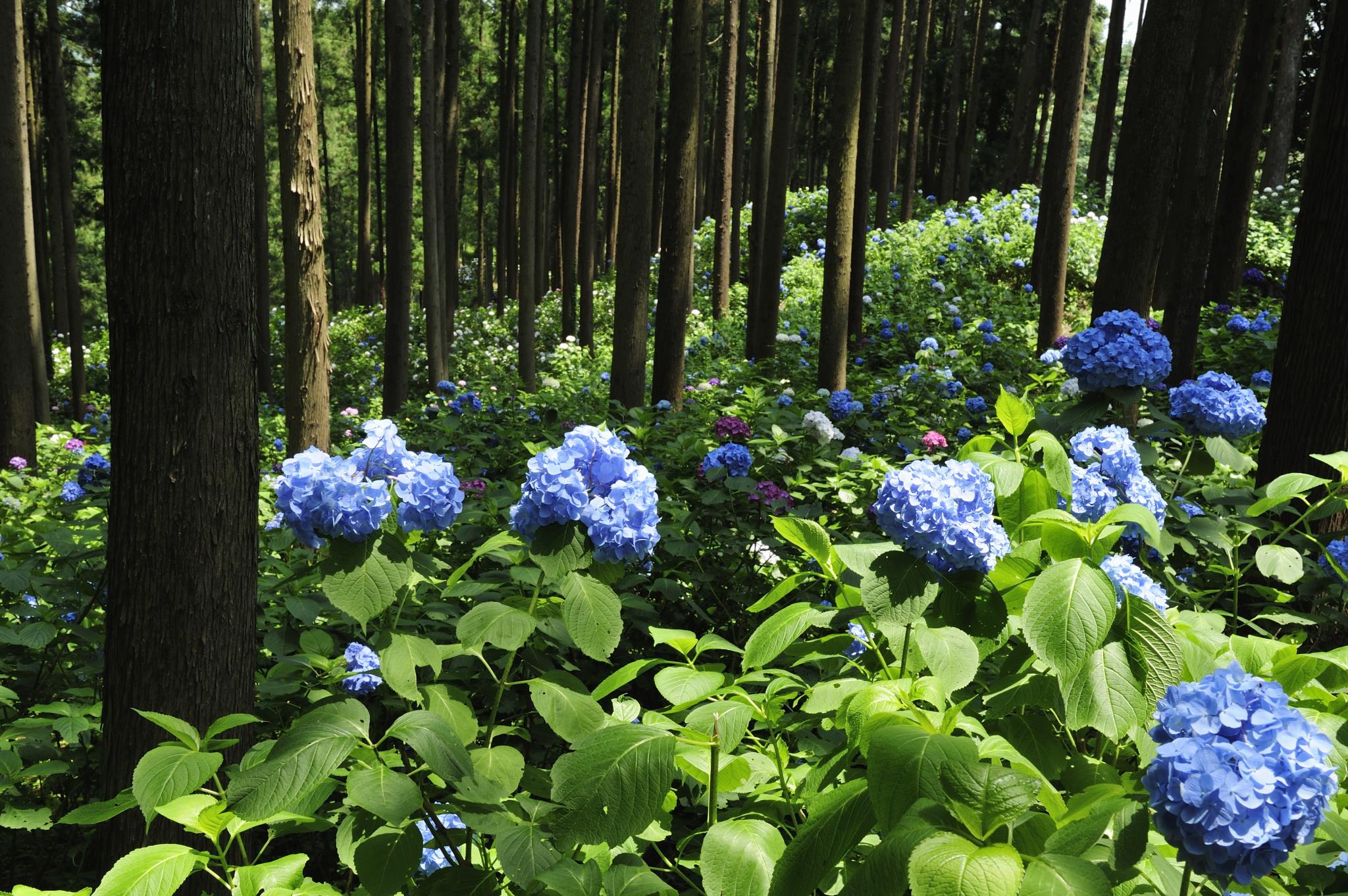 雄大でよく手入れされた林床に咲く紫陽花。
