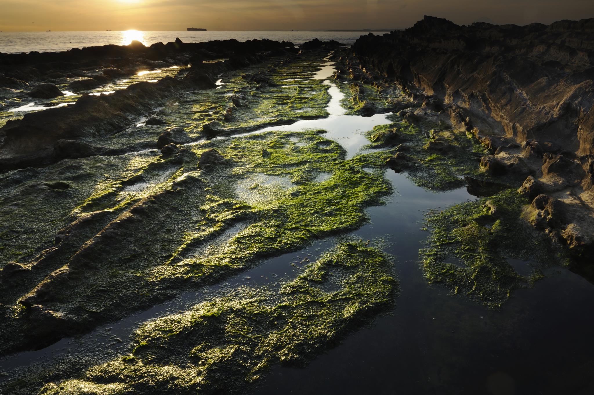 内房の明鐘岬(みょうがねみさき)です。平らな岩礁に緑のボウアオサが密着してます。