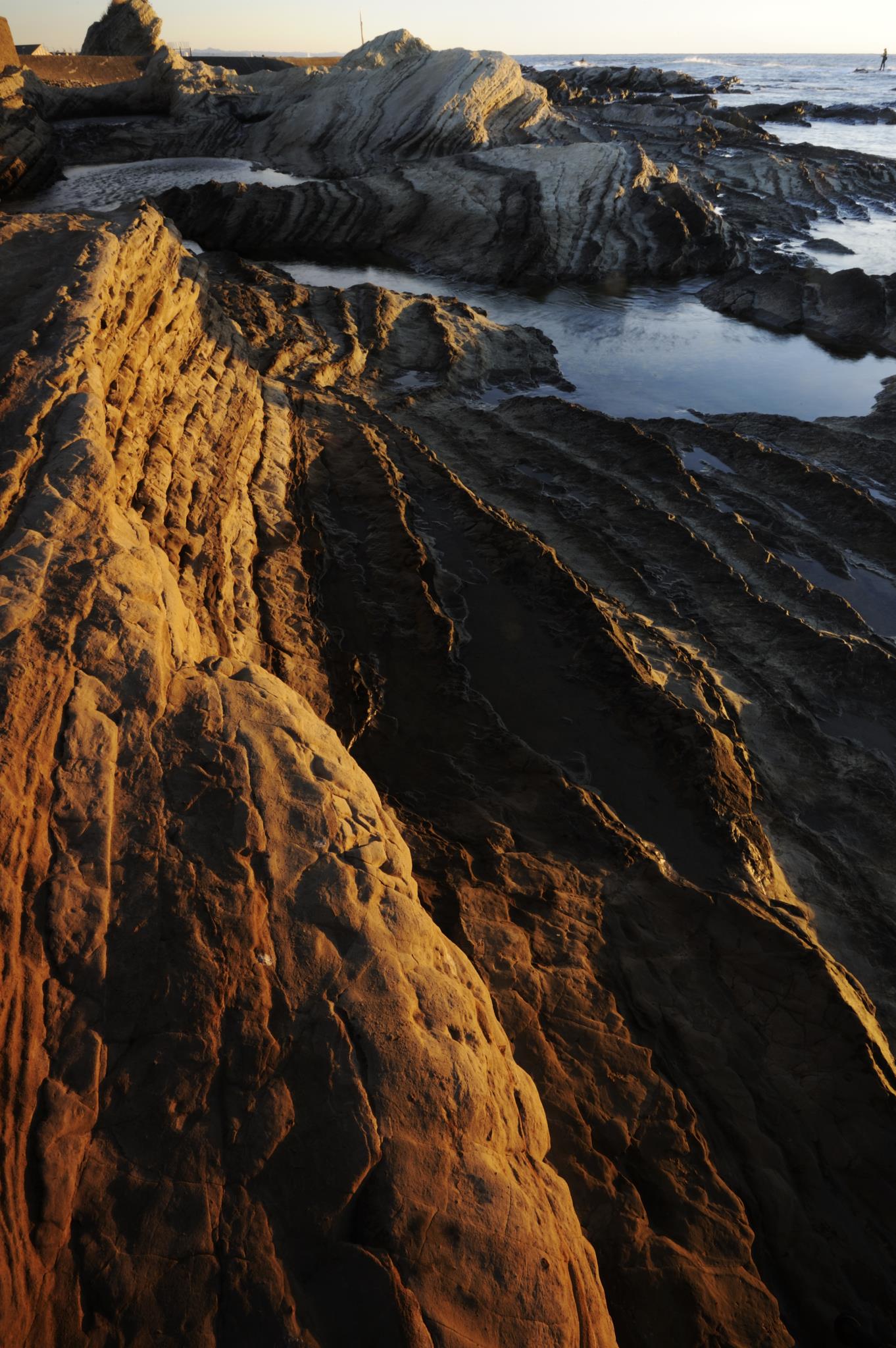 岩場に朝日が当たり好きな写真です 右端にも釣り人がいたのですね