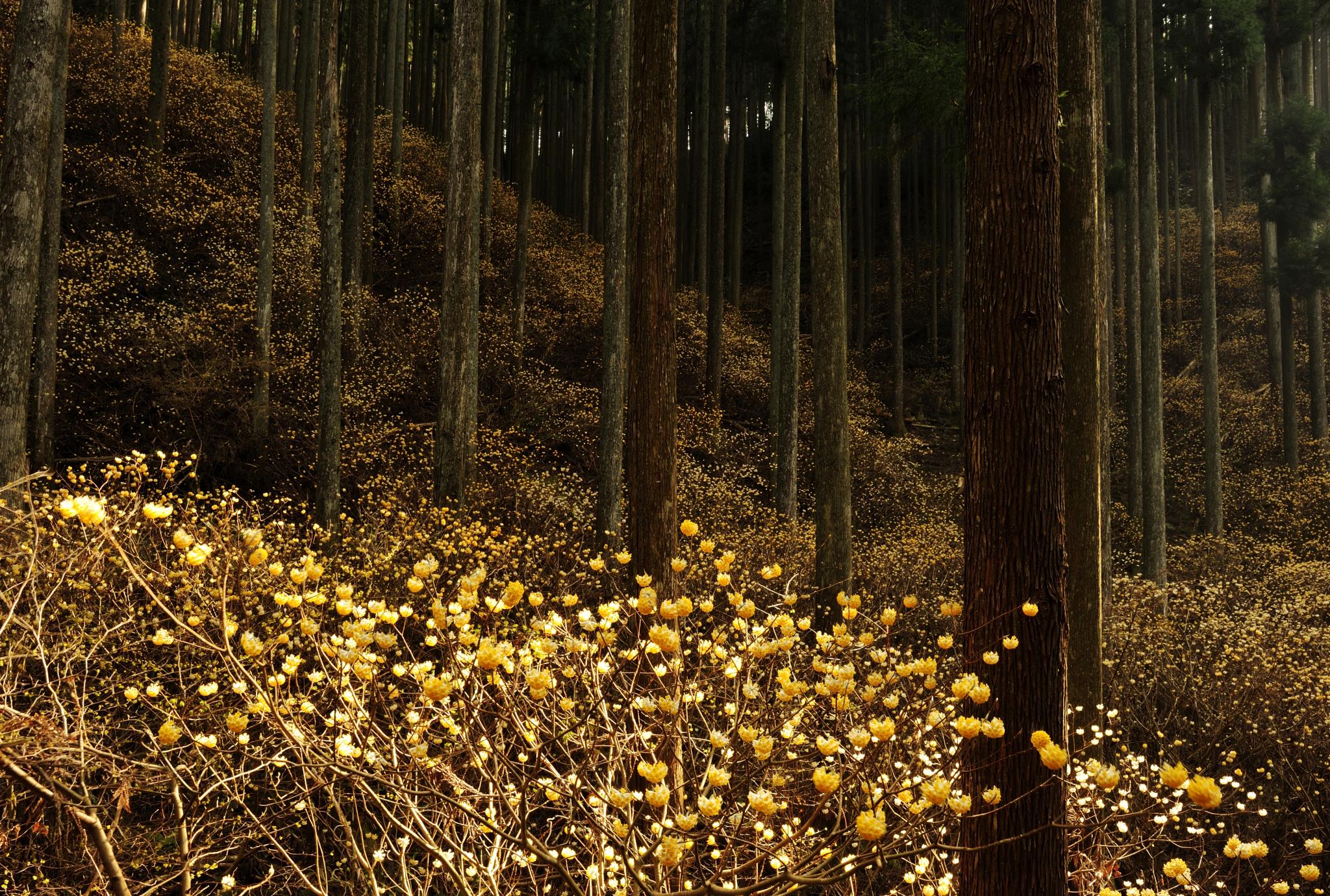 ミツマタが咲く林。