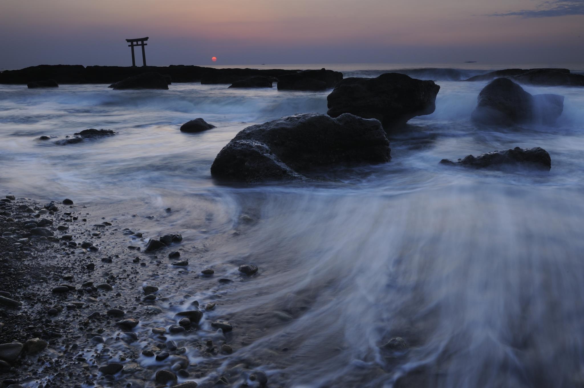 大洗の海岸は三度目ですが、こちら大洗磯前神社は初めてです。暗い内から海岸に出ましたが、すでに数人のグループがライトを