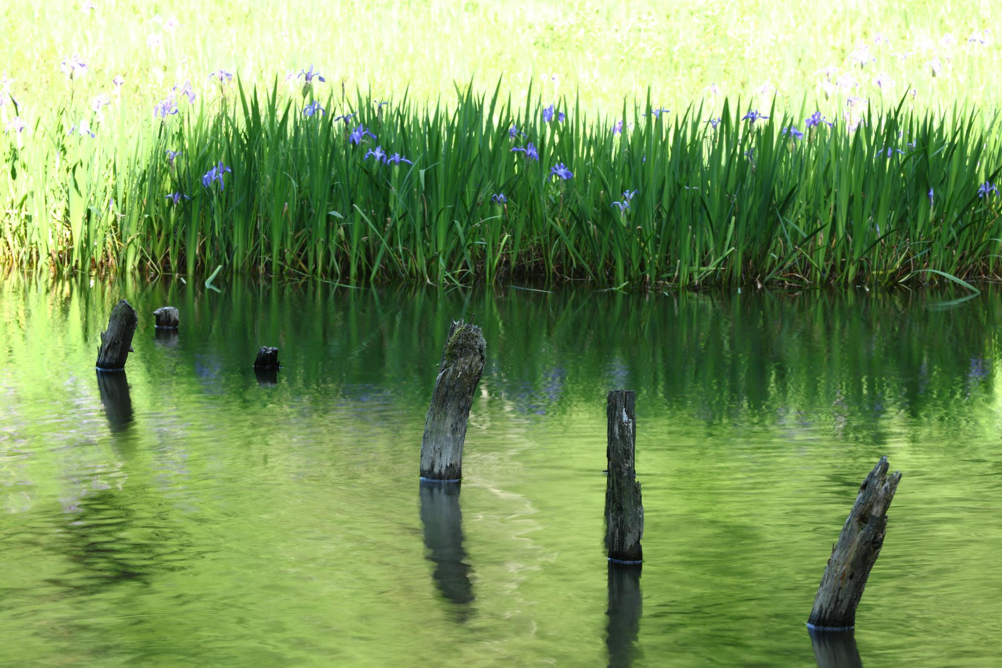 朽ちた杭がカキツバタと巧みに対比された構図です。