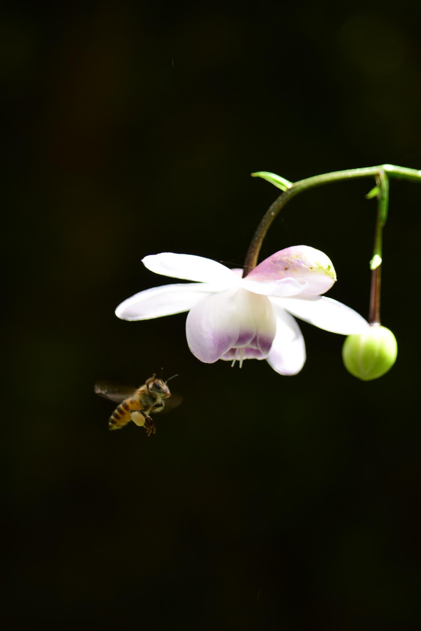 こんにちは。黒をバックに素晴らしいですね。まさに森の妖精に蜂も一緒に戯れに来ましたね。何とも微笑ましいシーンですね。