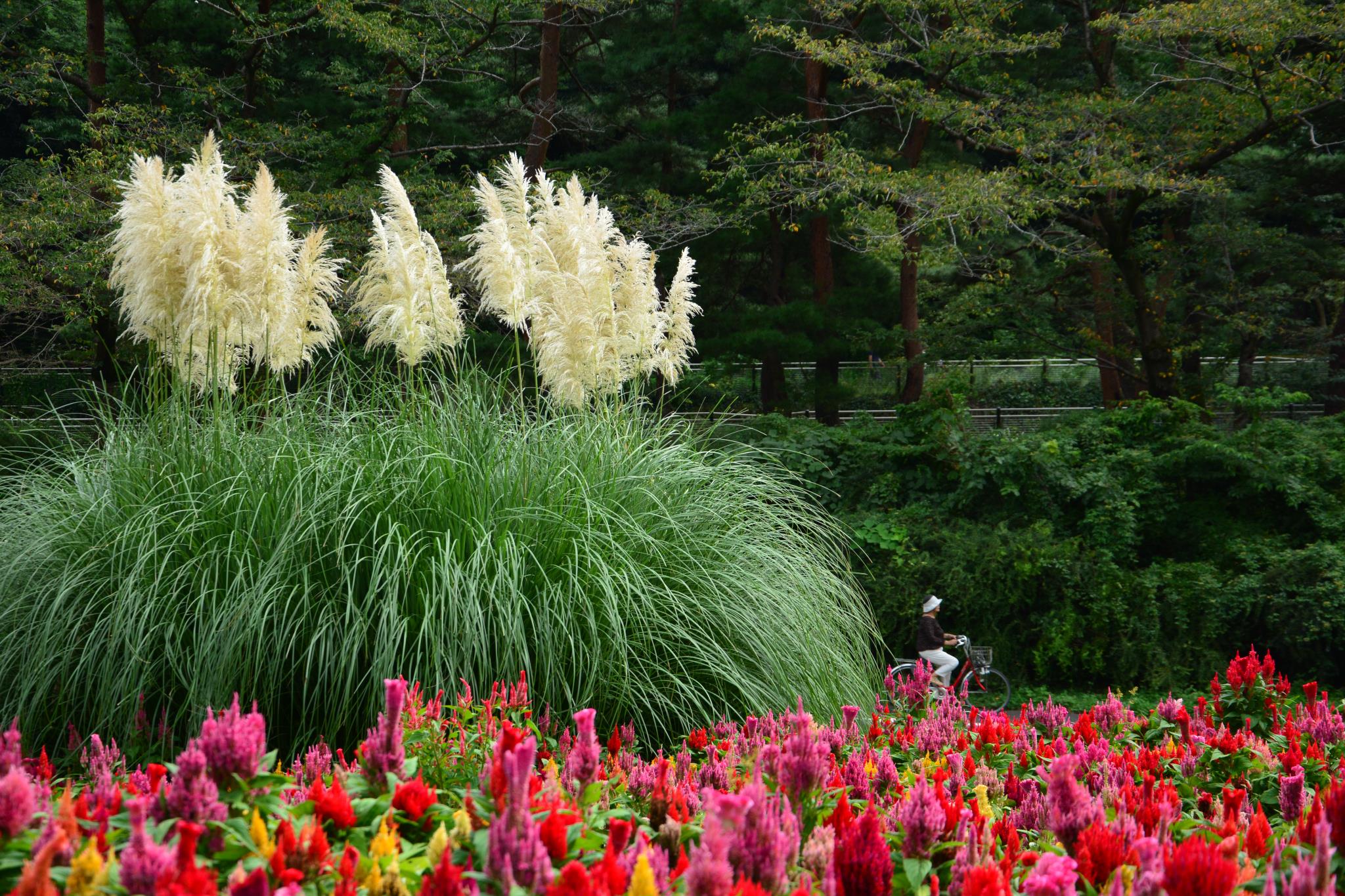 向こう側のサイクリングコース、ひっきりなしに自転車が通るのです。人を入れてみるとパンパスグラスの大きさが際立つかなぁと思って(笑)