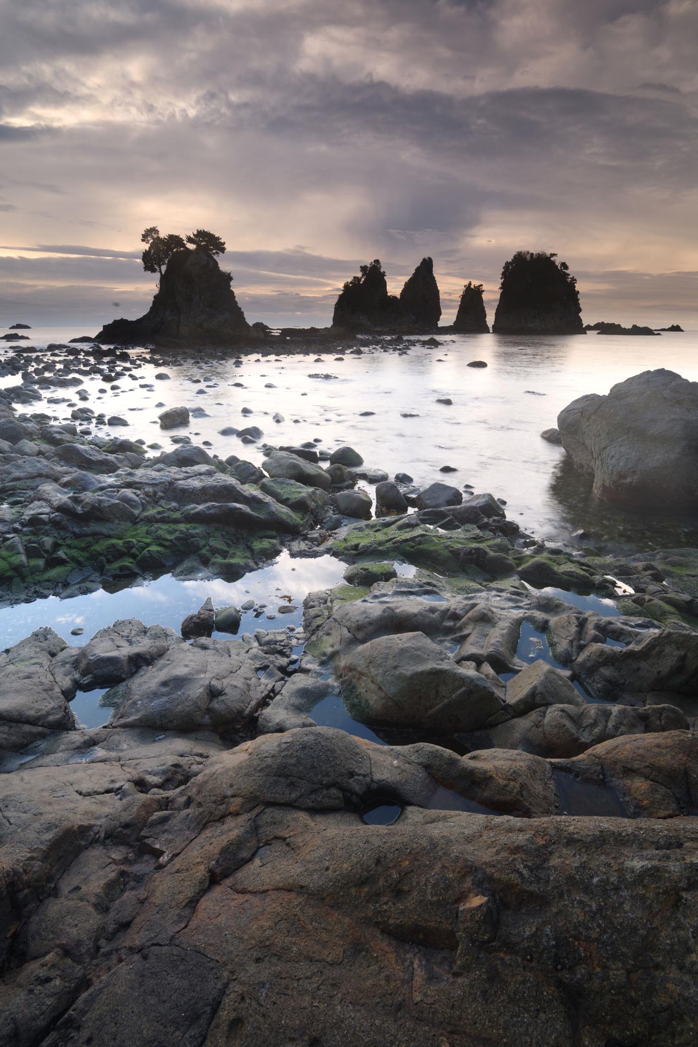 引き潮の岩礁。広角で被写体に寄って迫って手前に大きく添える。