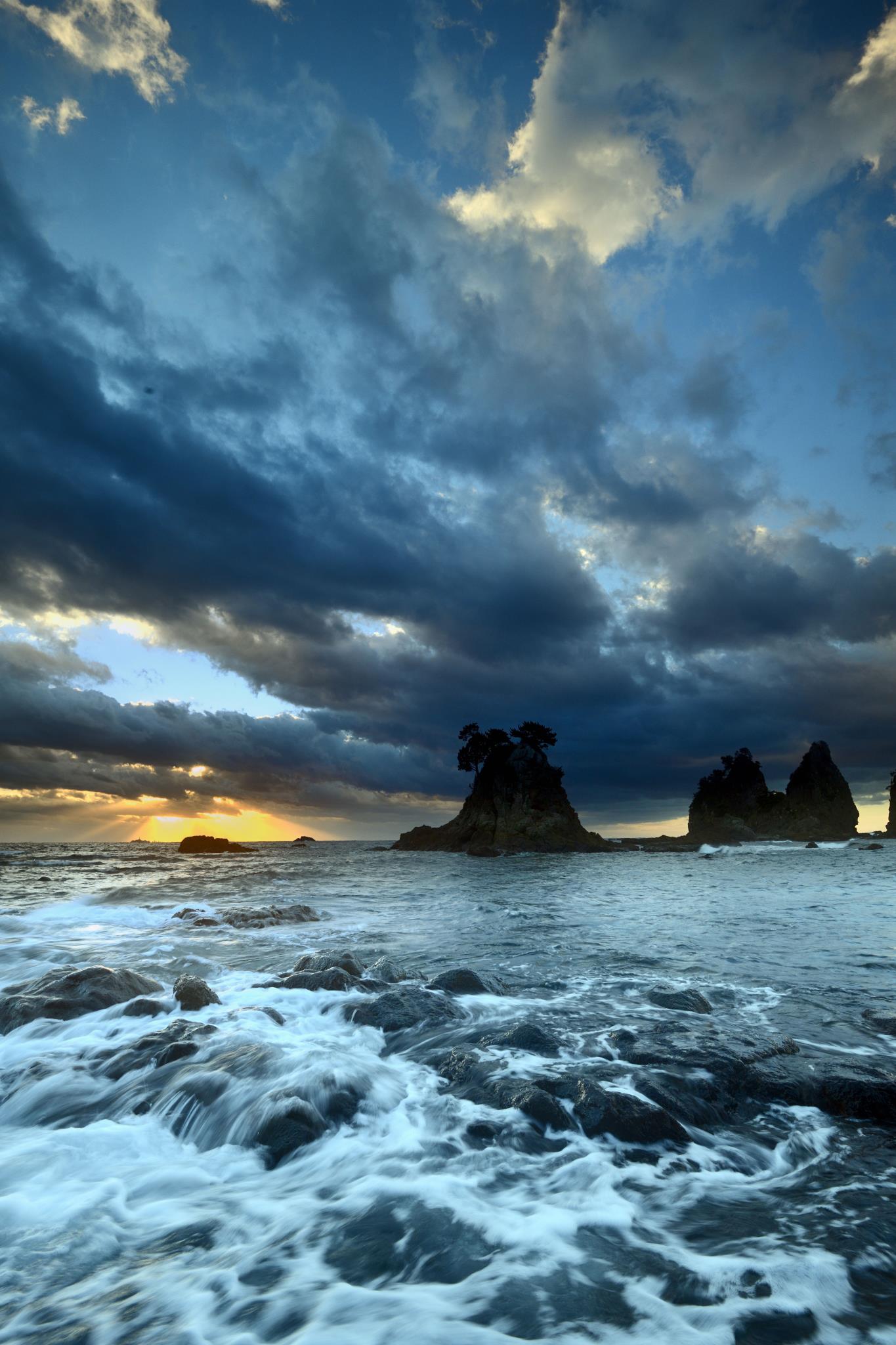 縦構図、手前には岩から砕け落ちる白波、空には大きく