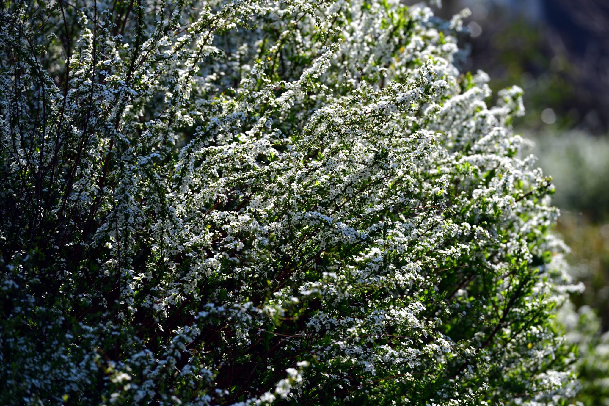 陽光の中、浅いピントで白と緑のコントラストが美しく仕上がりました。