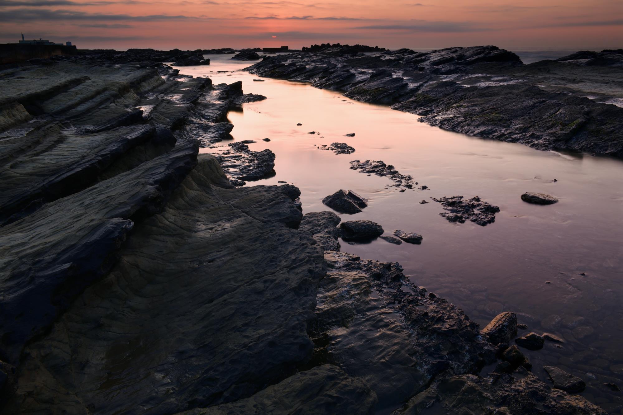 太陽が昇って間もない頃の夜明けと言うのでしょうか、空も赤く染まり水面には赤みを指して両サイドの黒光りした岩礁の静寂の朝の光景は見事ですね。