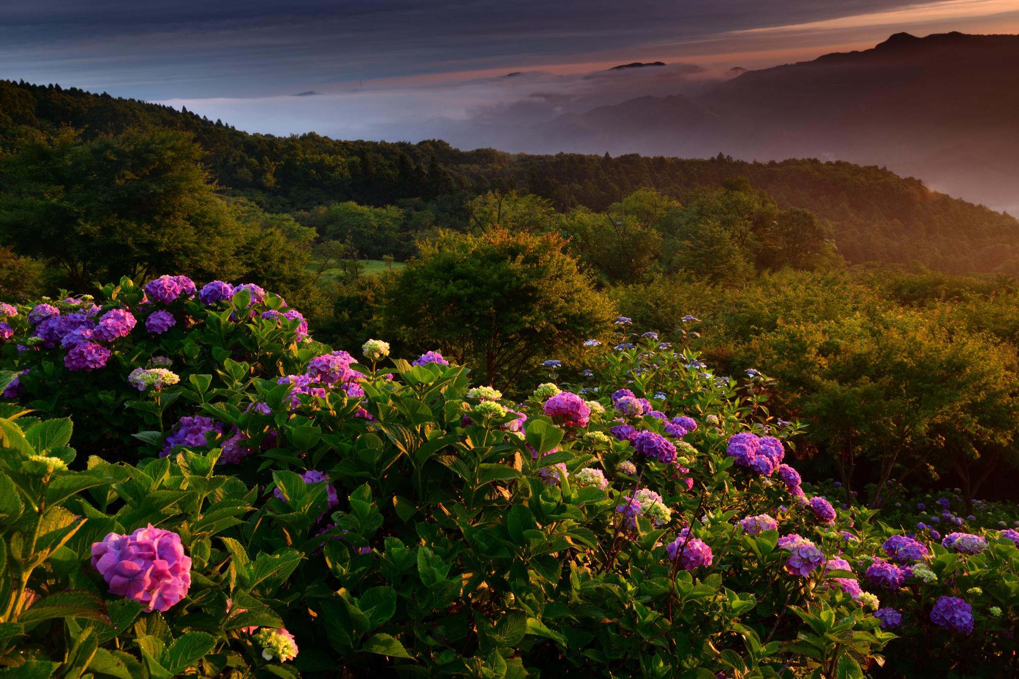 朝焼けに当たるアジサイの美しさを見事に表現されていますね 奥の雲海も最高でした
