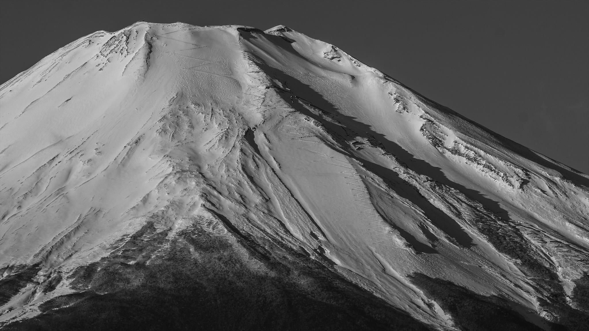 白と黒、色彩を削いだ厳冬期の富士が見事です。
