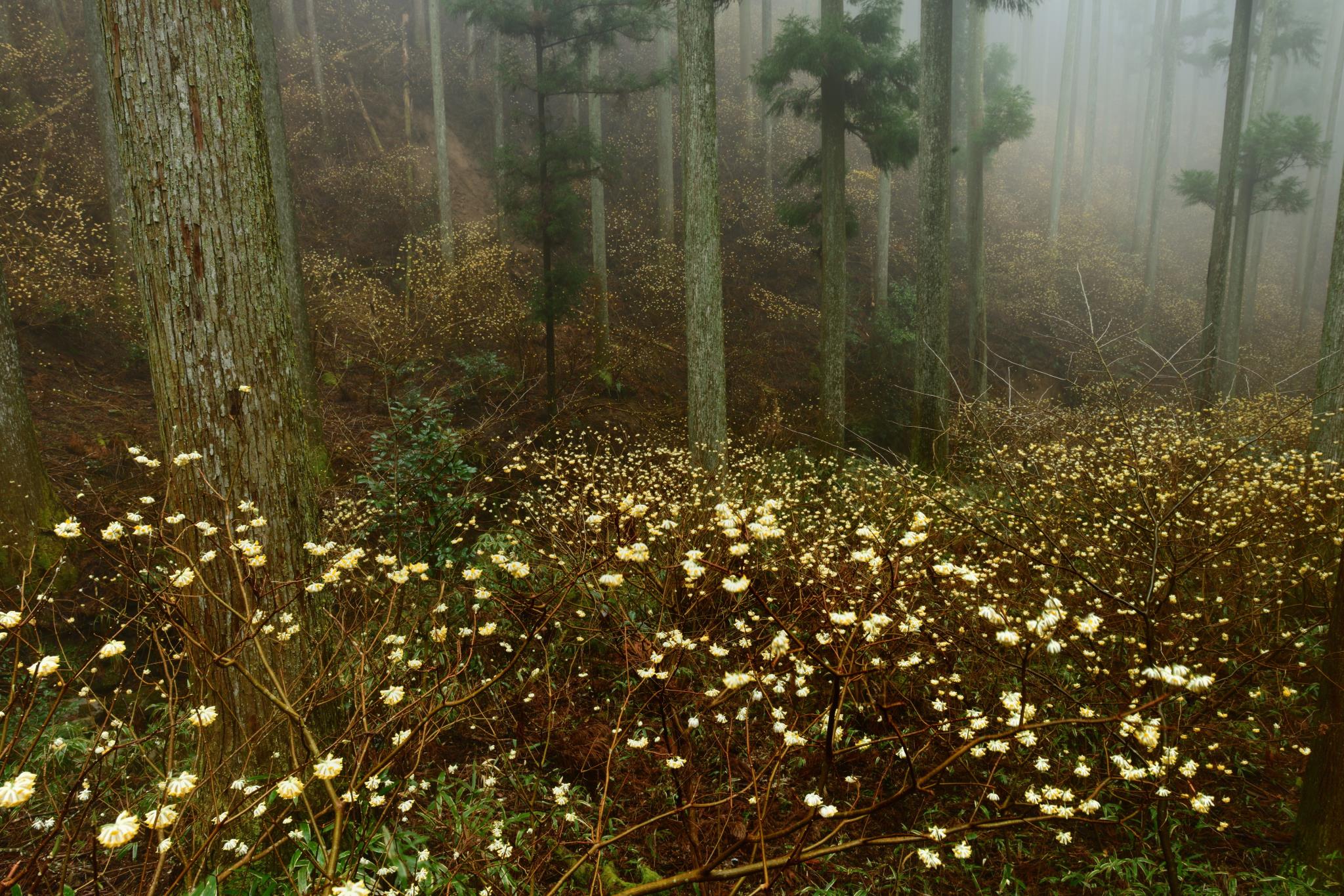 モヤの林床を見下げる撮影位置です。ミツマタは下向きに黄色い花を着けますので、見下げるカメラ位置は好ましくはないのですが。