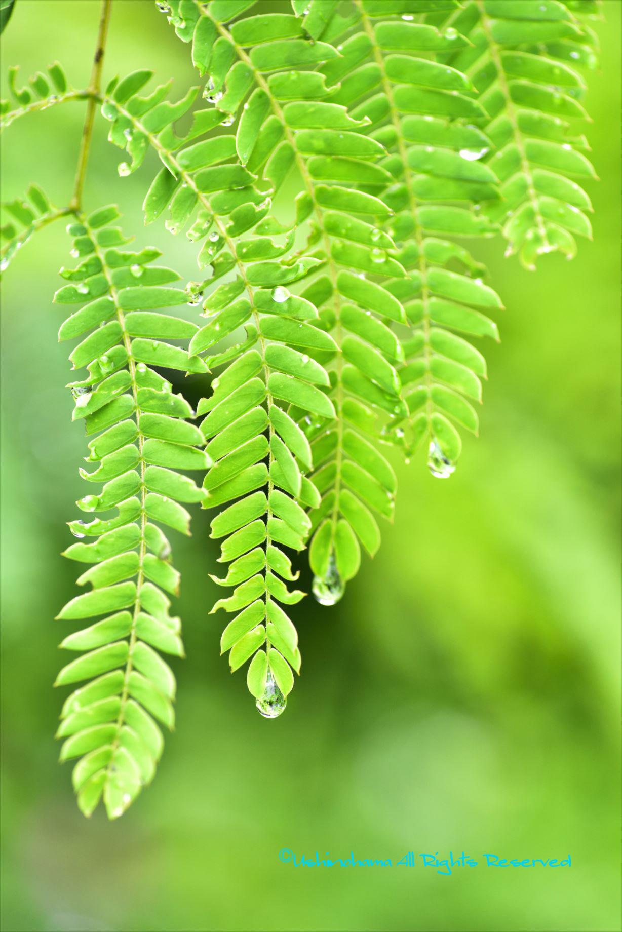 ねむの木の葉から滴がぽたぽた落ちています。