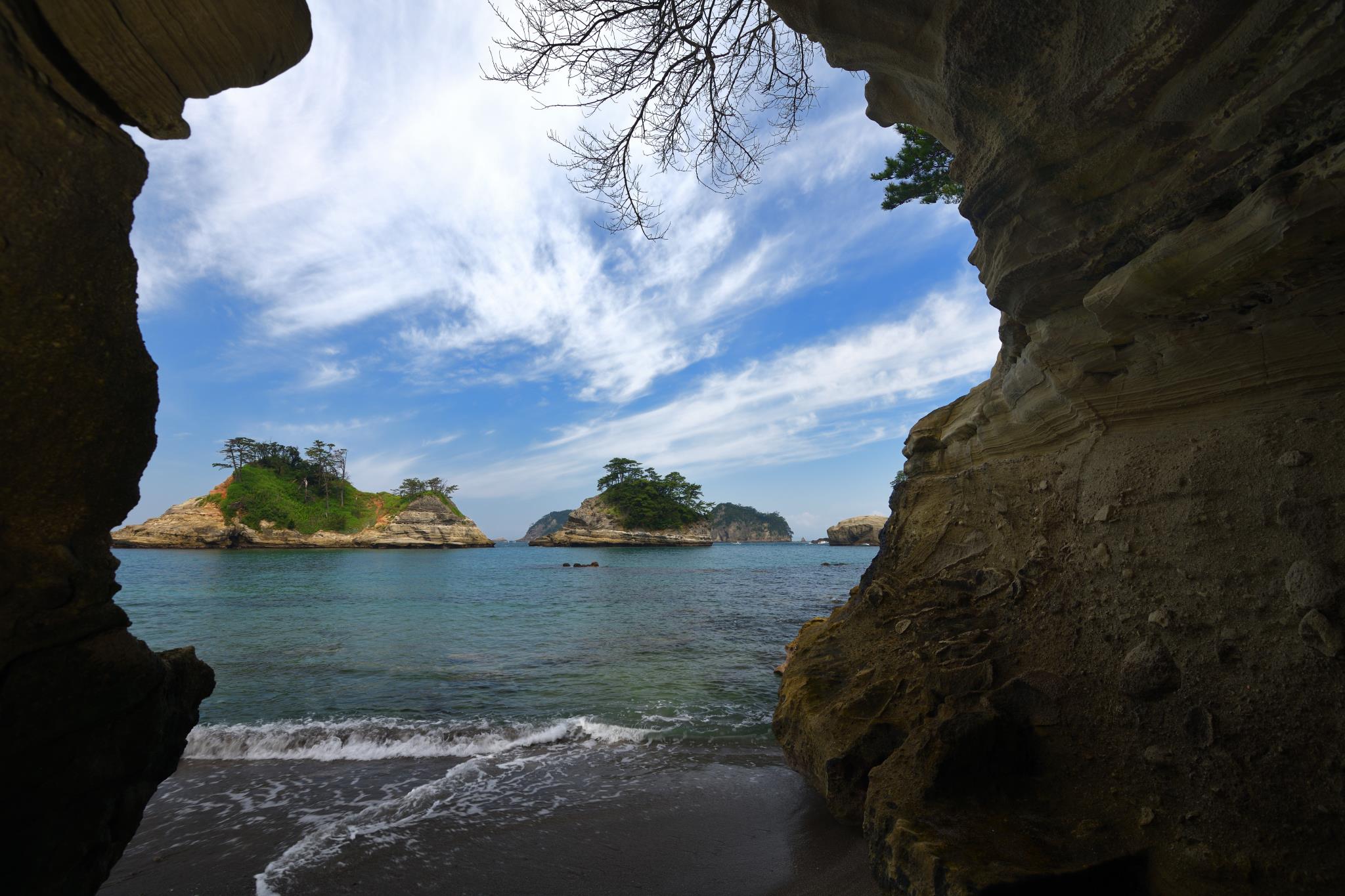真っ暗な洞窟から明るい堂ヶ島を望む。露光量の難しいシチュエーションです。