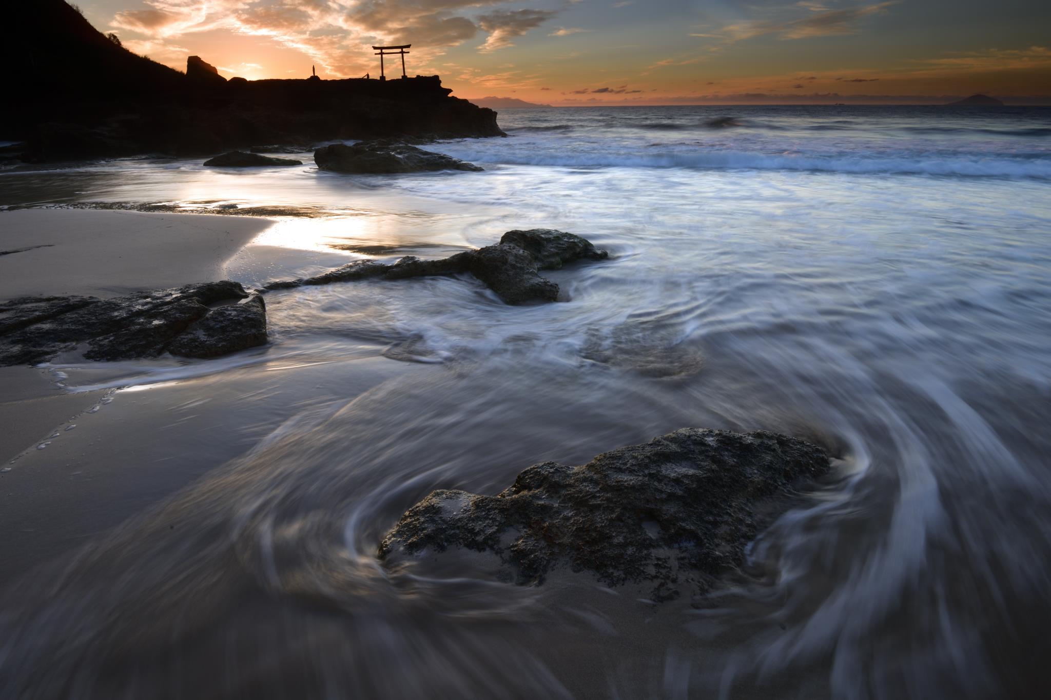 波がこの岩を回って引いて行く。