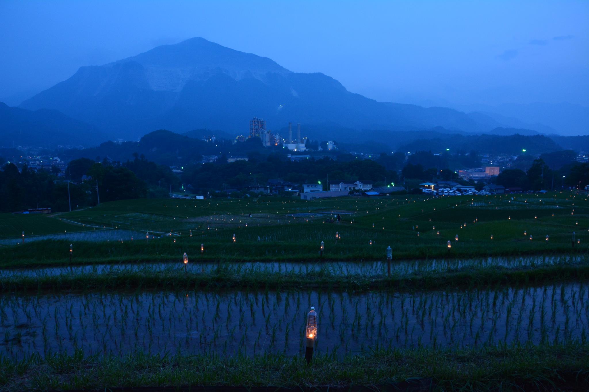 ほしざくらさんいよいよ灯したキャンドルが明るく見えてきました。ワクワクしだした時間ですね。田んぼの稲がよく見えて棚田の雰囲気が良いですね。途中で武甲山に雲がかかってちょっと心配しましたがすぐに無くなってよかったです。