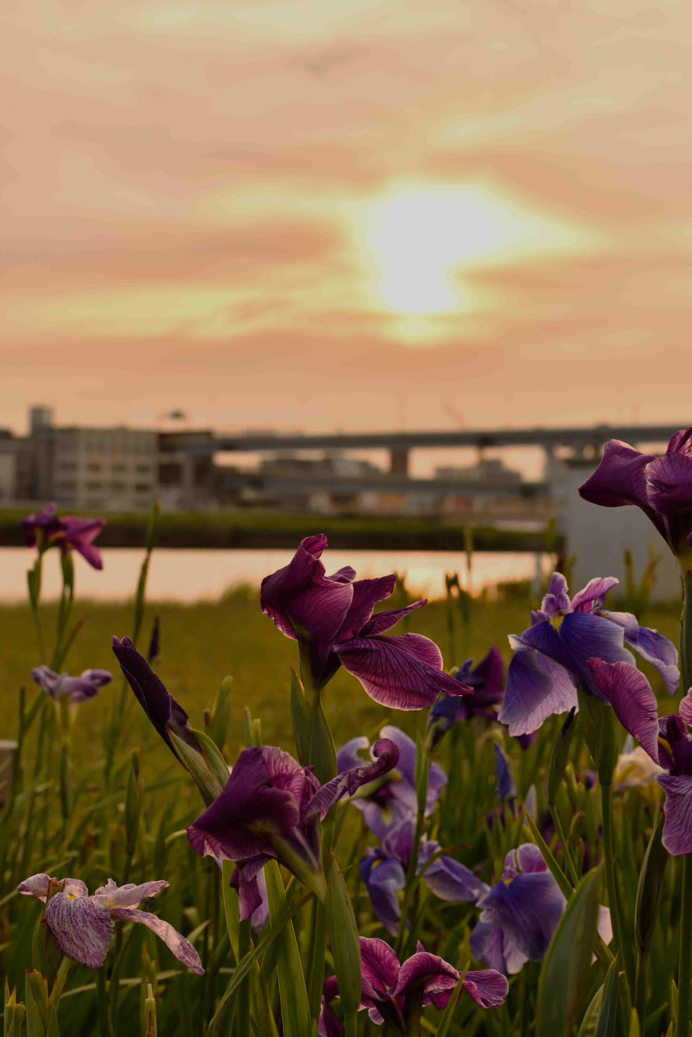 夕暮れの一時、花菖蒲が夕日を受け止めていました。