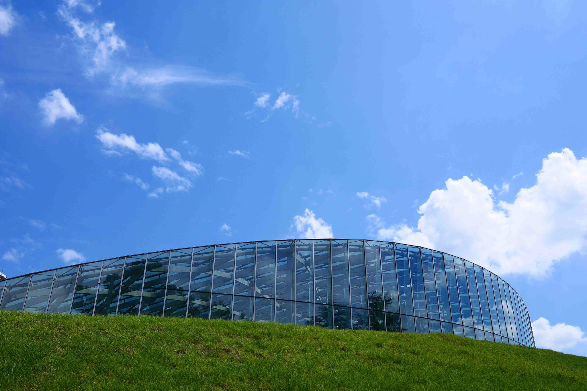 大温室を大空の下に入れて、空の広さがとても気持ちよく感じます。