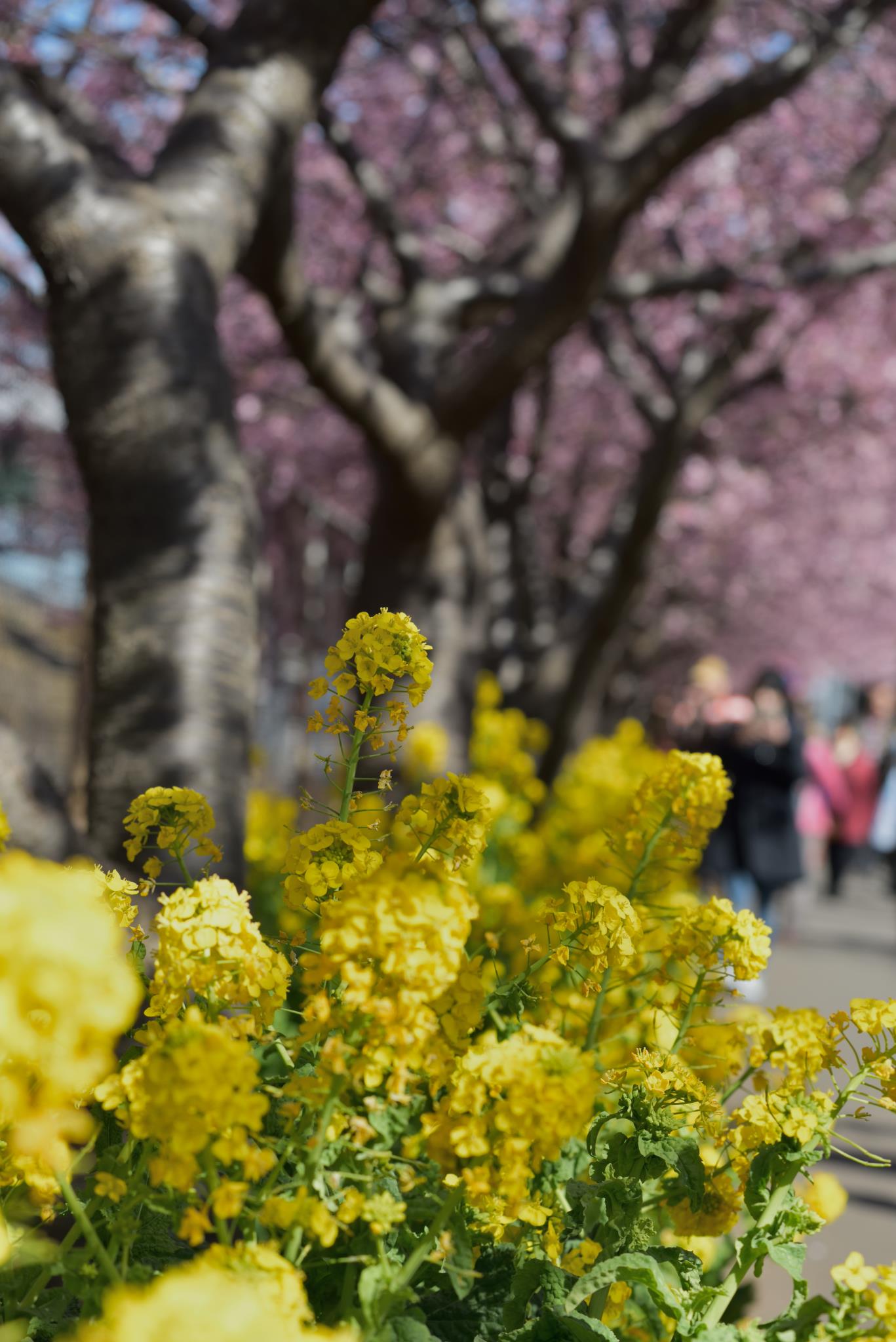 菜の花とのコラボを撮影できるところが河津桜のウリの一つだと思います。花が濃いピンクなのも菜の花の黄色に負けません。