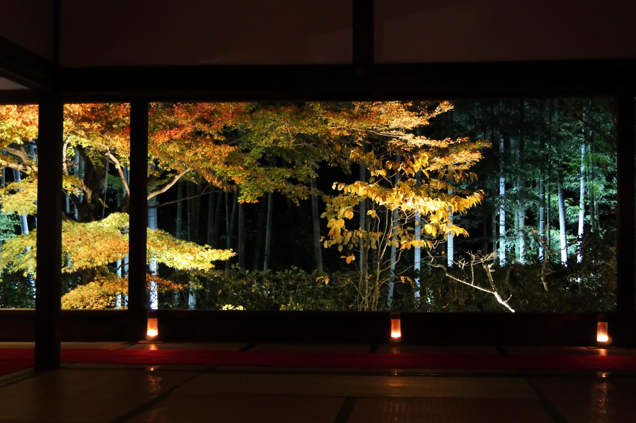 宝泉院きれいですね。ライトに浮かぶ色づいた葉、まっすぐの竹が光って華やかな中に幻想的な美しさだと思います。